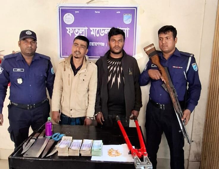 নারায়ণগঞ্জের ফতুল্লায় ডাকাতি কাজে ব্যবহৃত দেশিয় অস্ত্র, লুন্ঠিত ৮ লাখ টাকা ও স্বর্ণালংকার সহ ২ ডাকাত গ্রেফতার করেছে পুলিশ। রবিবার ভোররাতে ফতুল্লা মডেল থানা পুলিশ মুসলিমনগর েলাকা থেকে তাদের গ্রেফতার করা হয়। এর আগে পুলিশ নয়াবাজার মোঃ আব্দুল বাতেন এর বাড়ির সামনে অভিযান চালায়। পুলিশ ও জনগণের উপস্থিতি টের পেয়ে ৭/৮ জন ডাকাত দৌড়ে পালানোর চেষ্টাকালে মোঃ অলিউল্লাহ হাওলাদার ওরফে ওলিউল্লাহ (৩০) ও মোঃ জাকারিয়া হাওলাদার (২৮) কে গ্রেফতার করে। এ সময় তাদের দু’জনের হেফাজত থেকে ১ টি সুইচ গিয়ার চাকু, ১টি স্টিলের চাপাতি, ২ টি চাকু, ১ টি কাটার, ১ টি গ্যাস লাইটার/হিটার, নগদ- ৮ লাখ টাকা, ১ টি স্বর্ণের চেইন,১ টি স্বর্ণের আংটি, ছোট বড় বিভিন্ন ডিজাইনের ৪০ (চল্লিশ) পিস কানের দুল, উদ্ধার করা হয়।